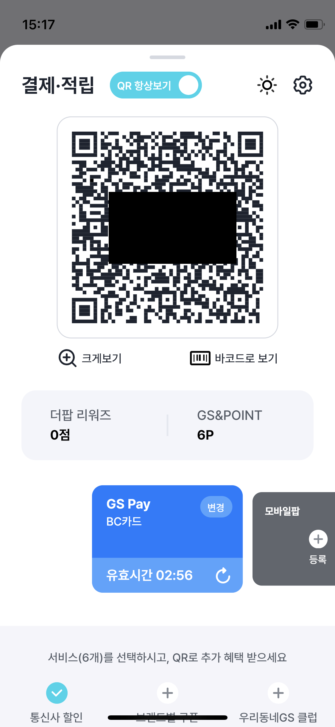 앱을 켜고, 이 화면을 보여주는 것만으로 카드결제 + 통신사 할인 (정확히는 포인트 차감)이 가능하다.